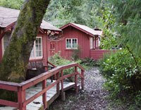 Overnight accommodations offering log cabins and campsites with redwood tent decks in a modern campground in an enchanted wooded park